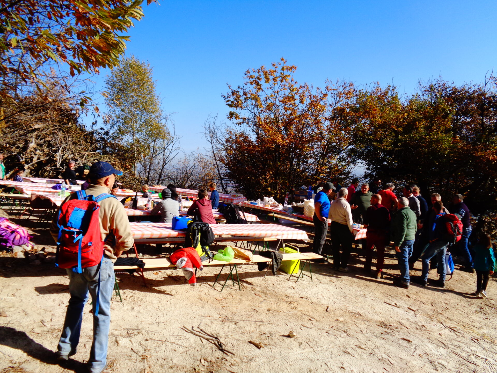 Ritornati sulla sterrata principale scorgiamo tra gli alberi l’isolato campanile di S.Leonardo, edificato nel 1930, e visibile da basso. In questa curva nel frattempo troviamo allestiti i tavoli della festa paesana, ci invitano a condividere insieme un piatto di pasta, ma dopo un saluto scendiamo su S.Sofia in cerca di tranquillita’. Bel posticino, ben tenuto dal gruppo ANA di Revello, con siepi e diverse tavoli pic nic dove sostiamo per il pranzo al sacco. Al ritorno deviamo per S.Biagio, patrono del paese dove un bel prato assolato ci invita ad una lunga sosta, mentre il vicino forte a pianta esagonale di Bramafam non e’visitabile, essendo in area privata, circondato dall’ uliveto, che contrasto! un simbolo di guerra e uno di pace a contatto! Quante sorprese riserva la collina di Revello! Tornati all’auto ci aspetta, per concludere in bellezza la giornata, una sosta golosa al caseificio Valform della vicina Martiniana Po per un gelato e dell’ottimo formaggio di pecora e capra.