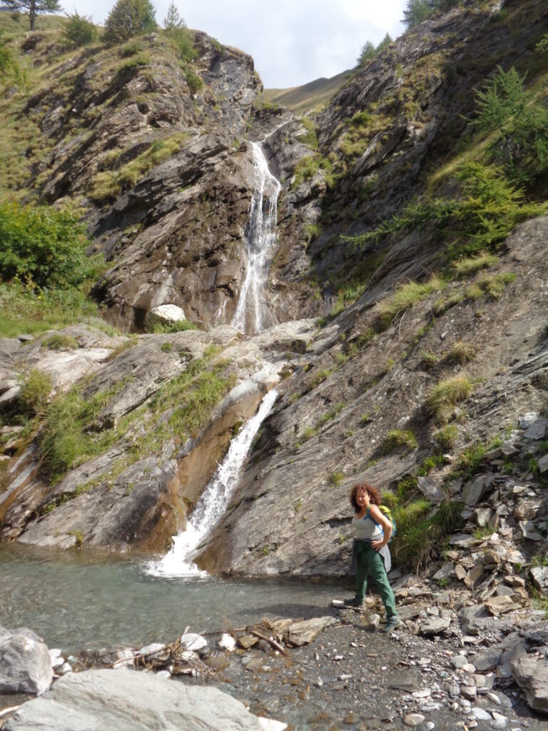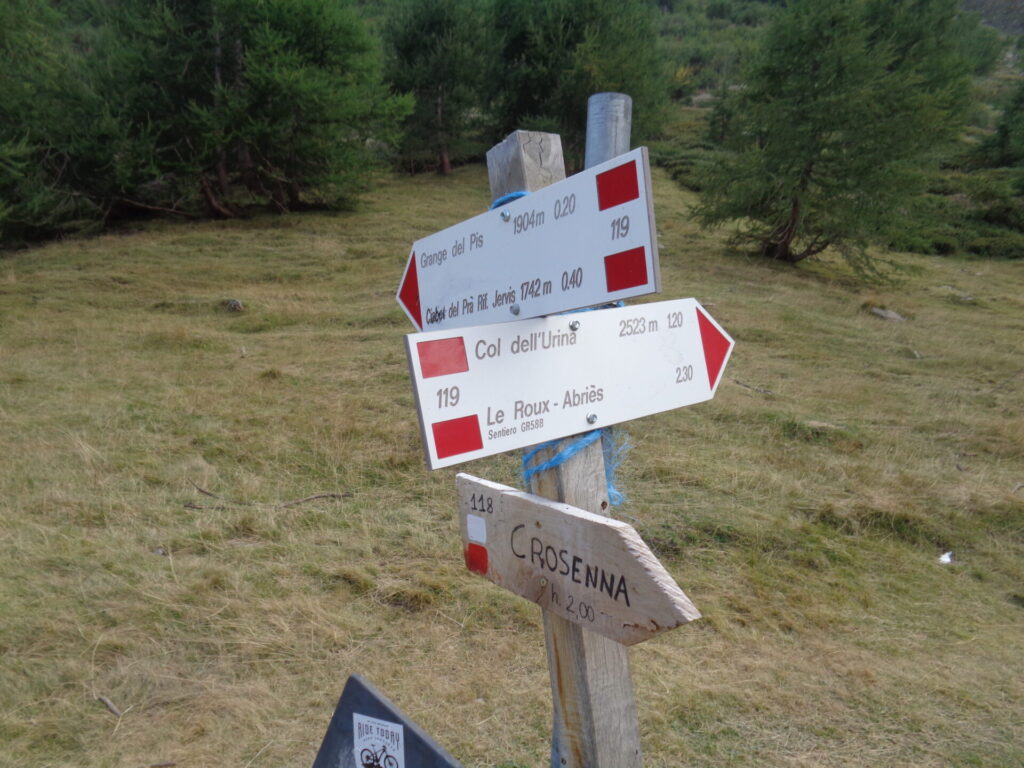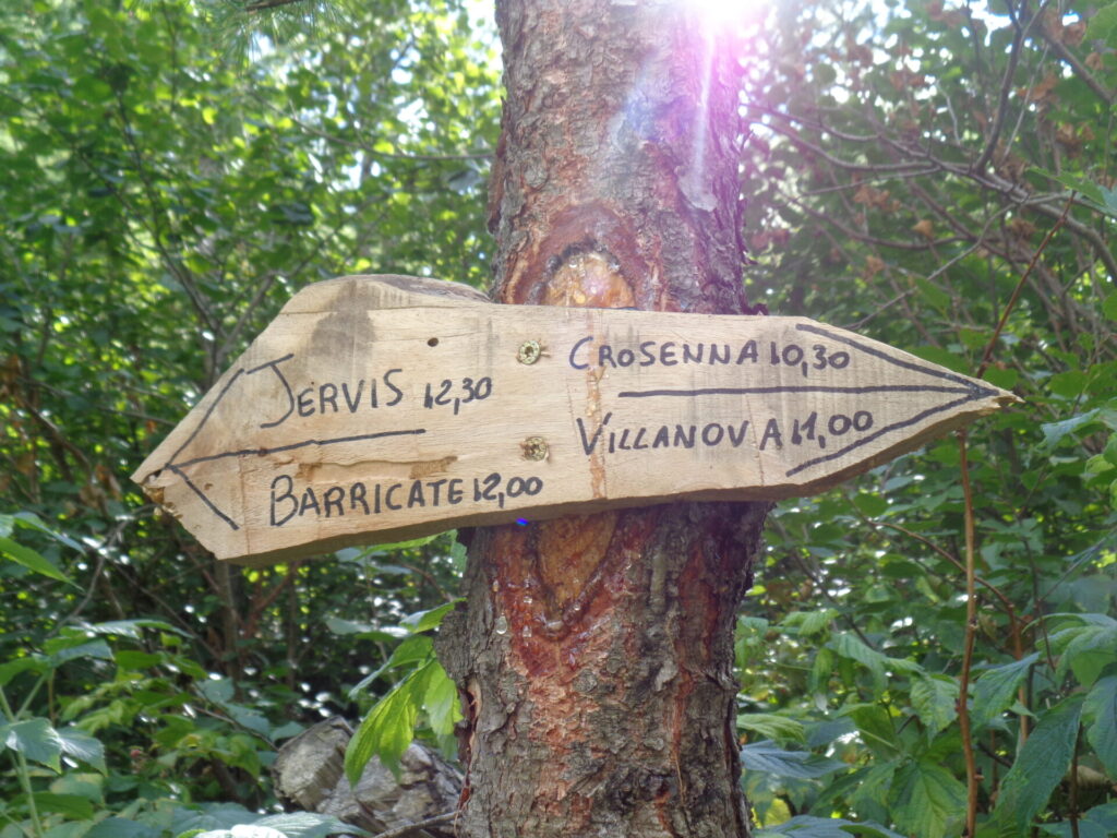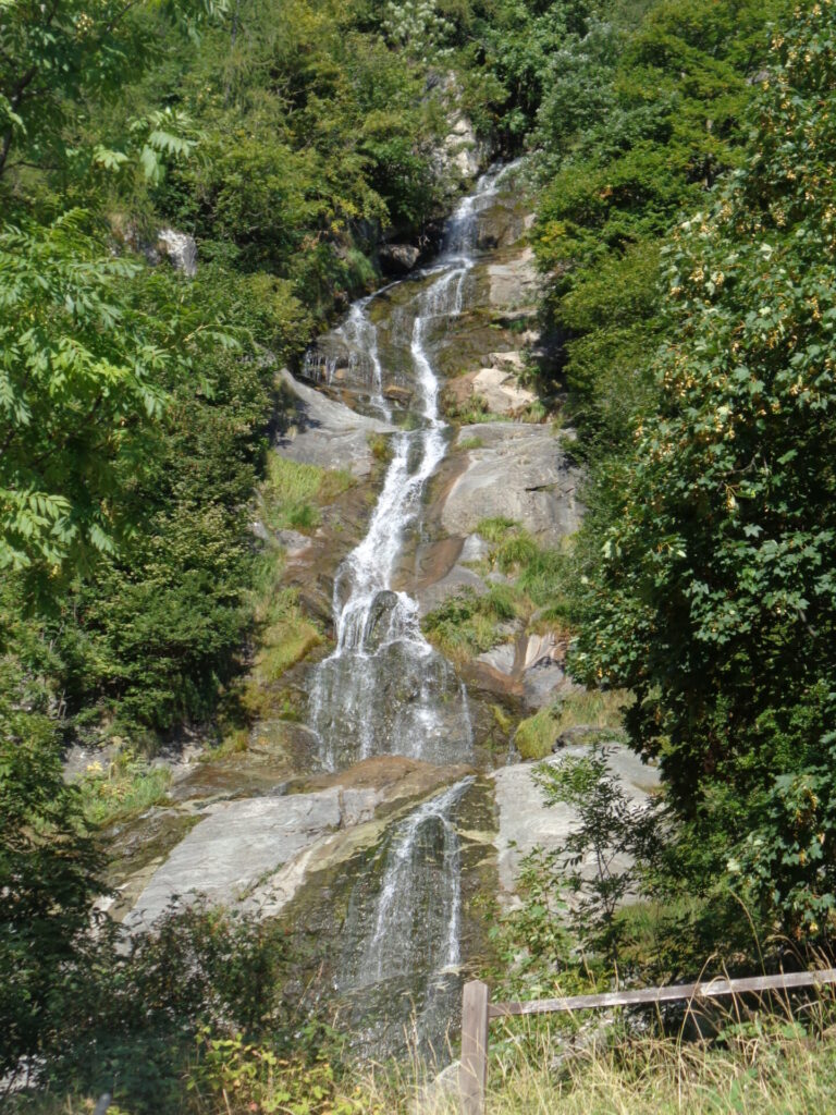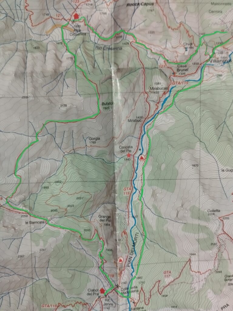 Fina agosto 2023: noi parcheggiamo l’auto all’ ingresso della borgata di Villanova Pellice (1230 m), ma la si può lasciare in un tornante più in alto (Villanova alto) così da portarsi subito sulla sterrata. Passate le prime case del borgo imbocchiamo il sentiero 121 in salita diretto all’ alpe Crosenna che raggiunge la pista forestale e dopo qualche centinaio di metri un altro sentiero a serpentine tra larici che si stacca sulla destra e conduce in poco meno di un’ora all’alpe, permettendo di ammirare belle cascatelle lungo il percorso. Nel pianoro dell’ alpeggio, dove prosperano spinaci e ortiche per la ricchezza di nitrati ,si possono acquistare tome e seirass e vi si trovano i locali ristrutturati del bell ‘? agriturismo La Porziuncola che al momento della nostra escursione è chiuso per motivi familiari. Saliamo alle ultime case per poi prendere il sentiero sulla sinistra che arriva al torrente Crosenna da guadare su pietre e poi sale ripido in bosco di larici con abbondanti lamponi nel sottobosco. Raggiungiamo il punto panoramico Bufafol e di costa i pendii della Gran Gorgia e poi il vallone dell’Urina , da qui si scendiamo al pianoro Grange del Pis e poi alla conca del Prà col bel Rifugio Willy Jervis (1700 m). Qui avevo dormito col Camminaitalia del 99 in discesa dal Rifugio Viso, per affrontare l’ indomani la lunghissima tappa verso Ghigo di Prali per la quale era prevista la levataccia alle 4 del mattino. Ricordo che la sera prima Teresio Valsesia, uno degli organizzatori del Camminaitalia, aveva sgridato dei ragazzi per il chiasso mentre cercavamo di dormire e questi per vendetta ci hanno legato alle ringhiere delle scale tutti gli scarponi (lasciati fuori delle camerate), ritardandoci così la partenza il mattino dopo! Dopo la sosta al rifugio scendiamo di poco lungo la sterrata di discesa per prendere il sentiero dell’ inverso, dall’ altra parte del torrente e che rispetto alla mulattiera si rivela più selvaggio e ombroso, ma con vari grossi massi da aggirare e qualche cavo per agevolare e in circa 1 h 30 ritorniamo al punto di partenza.